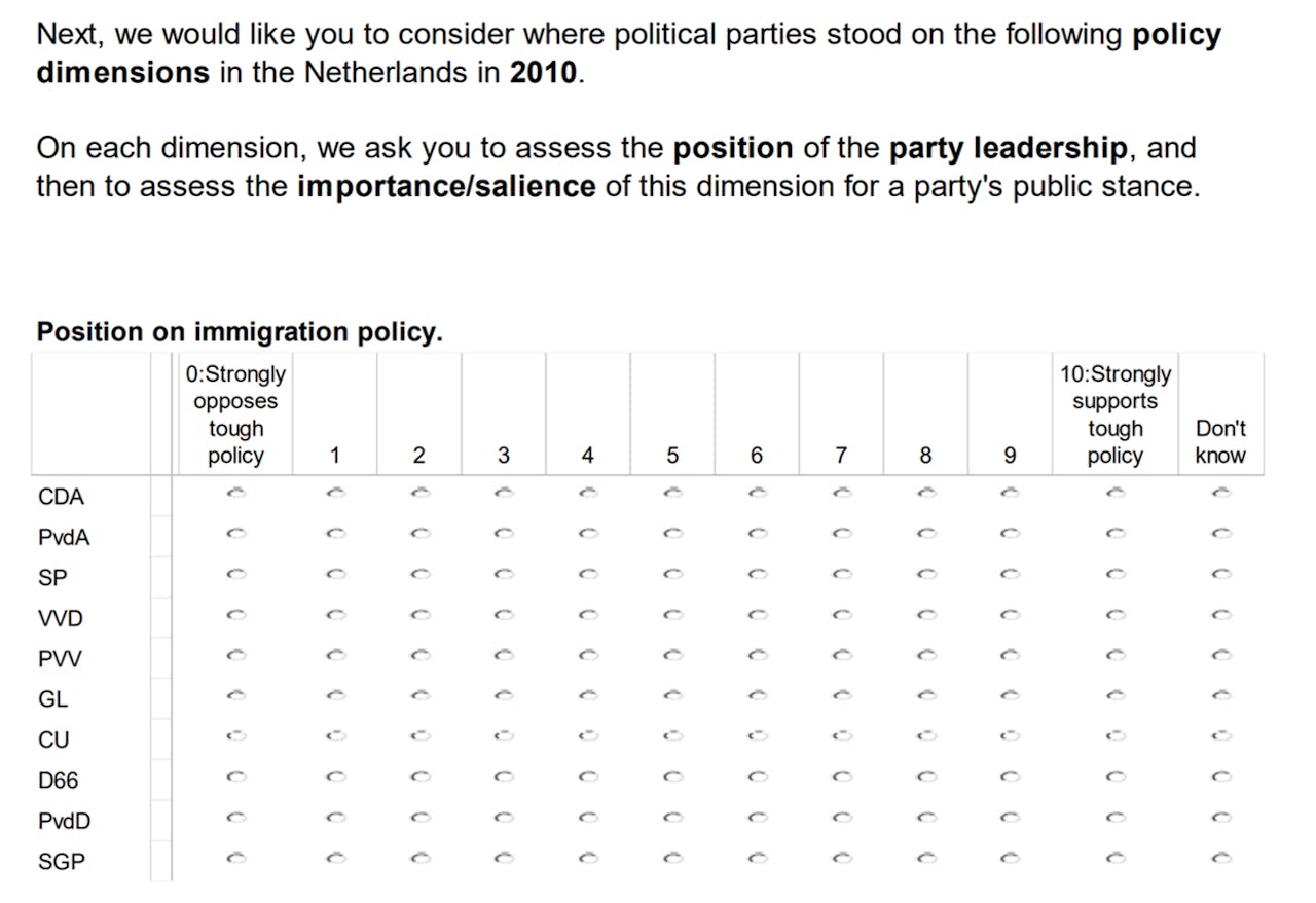 Een manier om beleidsvoorkeuren van partijen te meten is door mensen met veel kennis over politieke partijen te ondervragen, bijvoorbeeld politicologen die veel onderzoek doen naar de Nederlandse politiek. Zij vullen dan een vragenlijst in waarin zij partijen op verschillende beleidsdimensies plaatsen, bijvoorbeeld over Europese integratie, abortus of een algemene links-rechtsschaal. Een voorbeeld van zo’n enquêtevraag zie je hieronder.