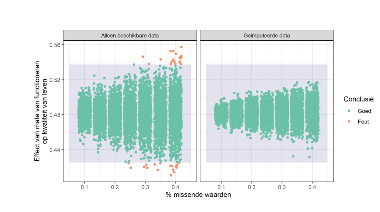 Figuur 2, het effect van mate van functioneren op kwaliteit van leven in een simulatie. Hoe groter het aantal patiënten waarvan we niet weten wat hun mate van depressie was, hoe onzekerder onze schatting van het effect. Met imputatie is de onzekerheid echter minder (aangezien we de informatie van alle patiënten kunnen gebruiken), en trekken we geen foute conclusie (het doorzichtige blok)