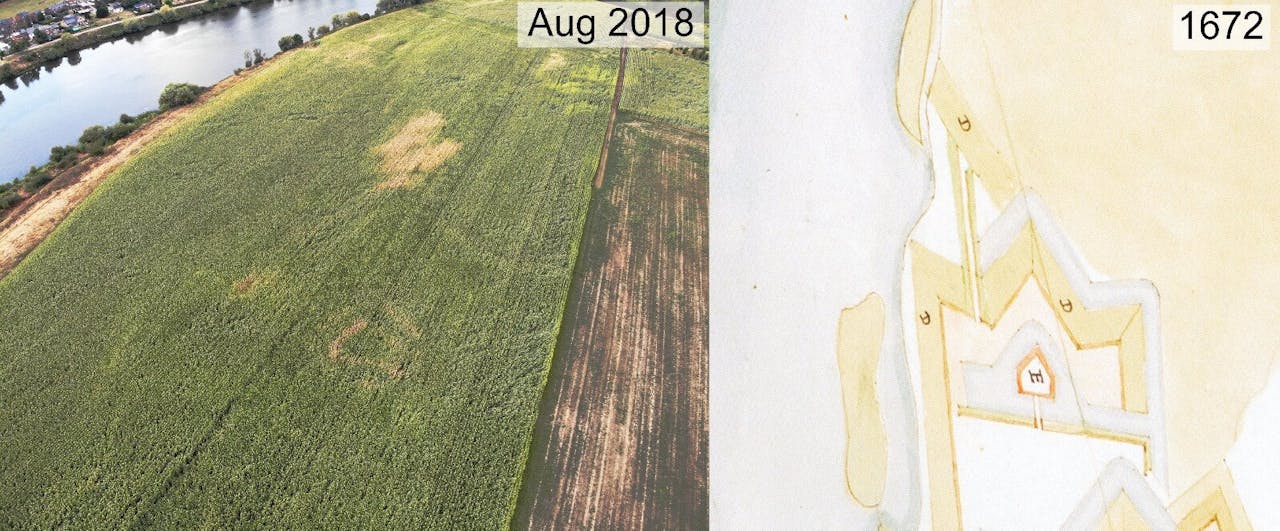 Door de droogte worden archeologische grondsporen zichtbaar. Hier het Spaanse fort Navagne, uit de zeventiende eeuw. Het fort, ook wel de Elvenschans genoemd, ligt aan de rivier de Maas bij het Limburgse Eijsden. De Spanjaarden bouwden het in 1634 en na de Opstand (1568-1648) bleef het fort in gebruik als tolhuis.