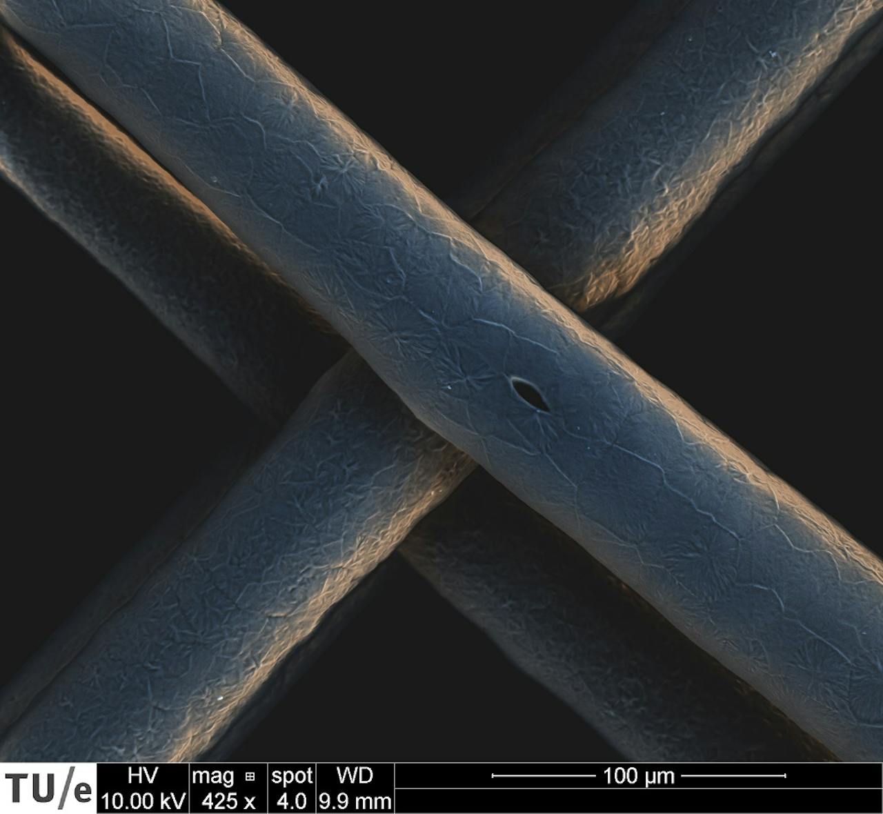Sterk vergrote opname van de vezels in de materialen die Wu ontwikkelt. De vezels ontstaan doordat de UPy-moleculen uit zichzelf op elkaar gaan stapelen en lange strengen vormen.