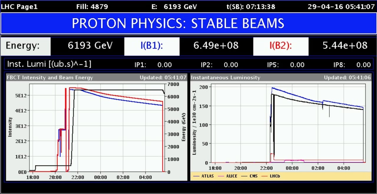 Het duurt even voordat een beam, een bundel van protonen, in de LHC versneld is tot de juiste energie. Het is niet simpel een knopje omzetten. Een hele reeks aan processen moet in gang worden gezet om ervoor te zorgen dat alles in goede banen wordt geleid. Maar als dat dan eindelijk is gebeurd en alles gecontroleerd is wordt “stable beam” verklaard en kunnen de botsingen beginnen.