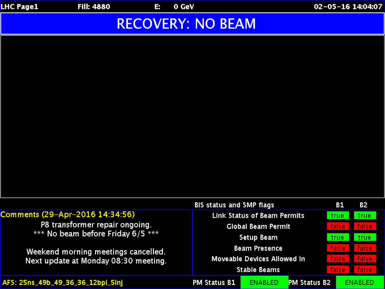 Na bijna zeven uur botsingen gaat er iets mis. De magneten van de LHC gaan in “fast abort” modus en sluiten zich af en de beam wordt gedumpt op de daarvoor bestemde plaats. Dit is een standaardprocedure en gebeurt wel vaker. Er wordt geprobeerd om te herstarten, maar het mag niet baten.