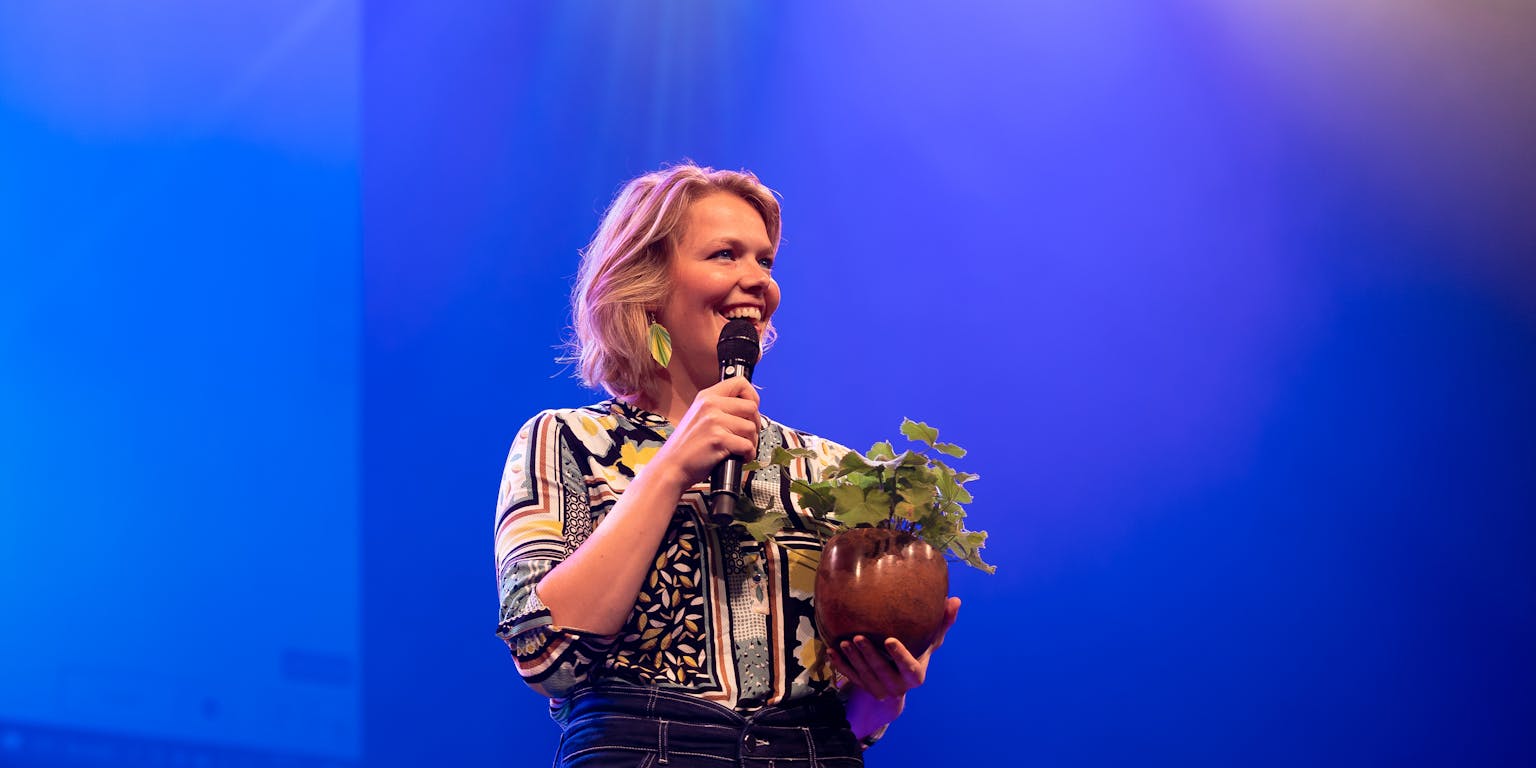 Even later was het zover. Mijn naam werd genoemd, samen met de namen van de twee andere finalisten van de Spotlight Prijs. Met z’n drieën liepen we het podium op. Er was van tevoren geloot over de volgorde van onze optredens en ik mocht als laatste. Ongeduldig keek ik vanuit de coulissen toe hoe de andere twee finalisten hun praatje gaven. Het waren zes lange minuten tot ik mijn naam weer hoorde. ‘Annemarie, ben je daar?’, riep de gastvrouw van de avond. ‘Jazeker’, zei ik en ik liep met mijn plant het podium op.