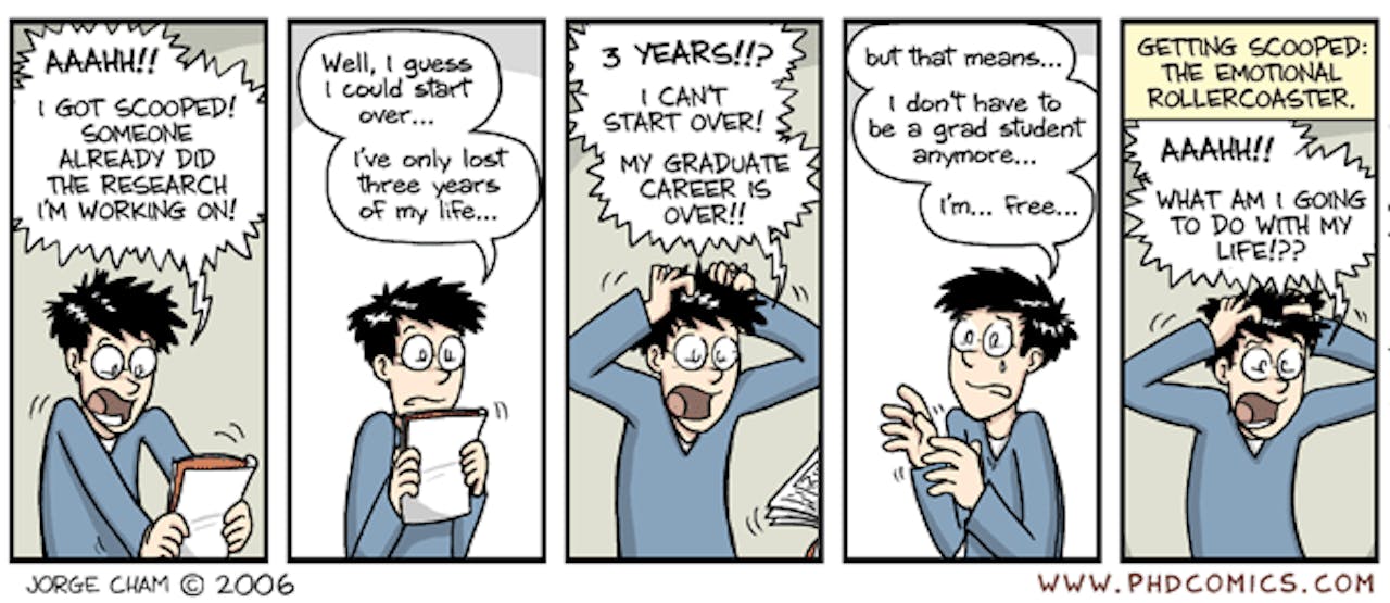 Wanneer zoiets gebeurt, dan ben je ‘gescoopt’. Een behoorlijk verdrietige situatie. Ik heb menig PhD student in tranen gezien wanneer hij/zij gescoopt bleek. Want alle tijd en energie die je aan je onderzoek hebt besteed, is dan eigenlijk voor niets geweest. Wat je aan het onderzoeken was, is dan al door iemand anders ontdekt. Jouw werk is niet nieuw meer. Je kunt het misschien niet eens meer ergens publiceren. Vreselijk.
