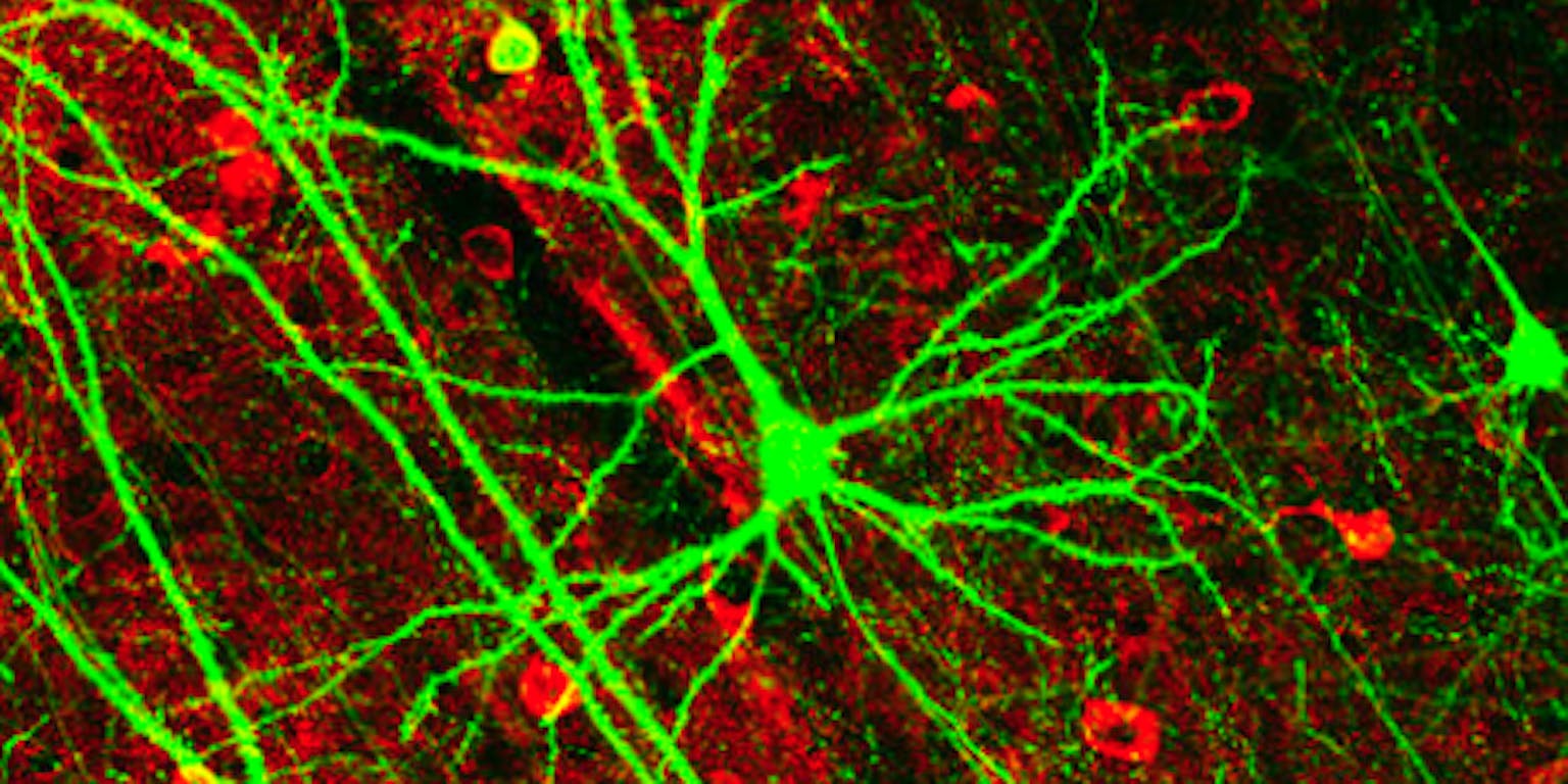 Vandaag loop ik mee met Willemieke Kouwenhoven, zij is een muisonderzoeker. Een van de dingen die we doen, is door de microscoop kijken naar een heel dun plakje van het brein van een muis. Om te kijken hoe het dopaminesysteem ontwikkelt, zijn bepaalde neuronen groen gekleurd en andere neuronen rood. Ik zie ineens op een hele andere schaal waar ik al jaren aan werk!