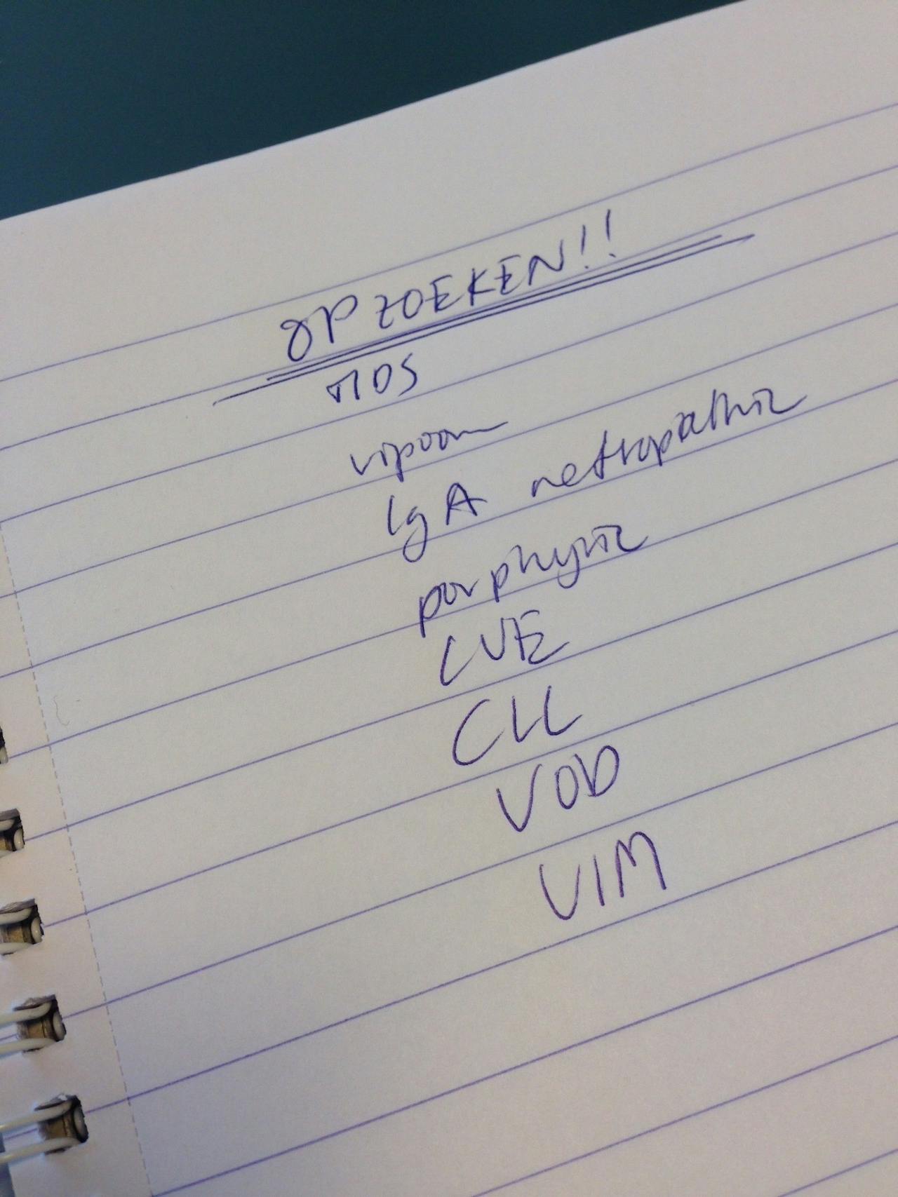 Marieke Rienks voor NEMO KennislinkAlsof ik weer voor de eerste keer naar de middelbare school ga loop ik, na lang zoeken, een kwartier te laat de ochtend-overdracht in. Ik ga snel zitten en luister. Alle opgenomen patiënten die afgelopen nacht erg zijn verslechterd en de patiënten die zijn opgenomen in het ziekenhuis, worden overgedragen aan de dagdienst. De termen en afkortingen vliegen me direct om mijn oren. Ik pak vlug mijn aantekeningenboekje, dat ik nog even snel bij de HEMA op het station heb weten te scoren, en begin druk te schrijven: “OPZOEKEN!!!: MDS, vipoom, IgA nefropathie, porphyrie, LVE, CLL, VOD, VIM…” Het begint me langzaam te duizelen.