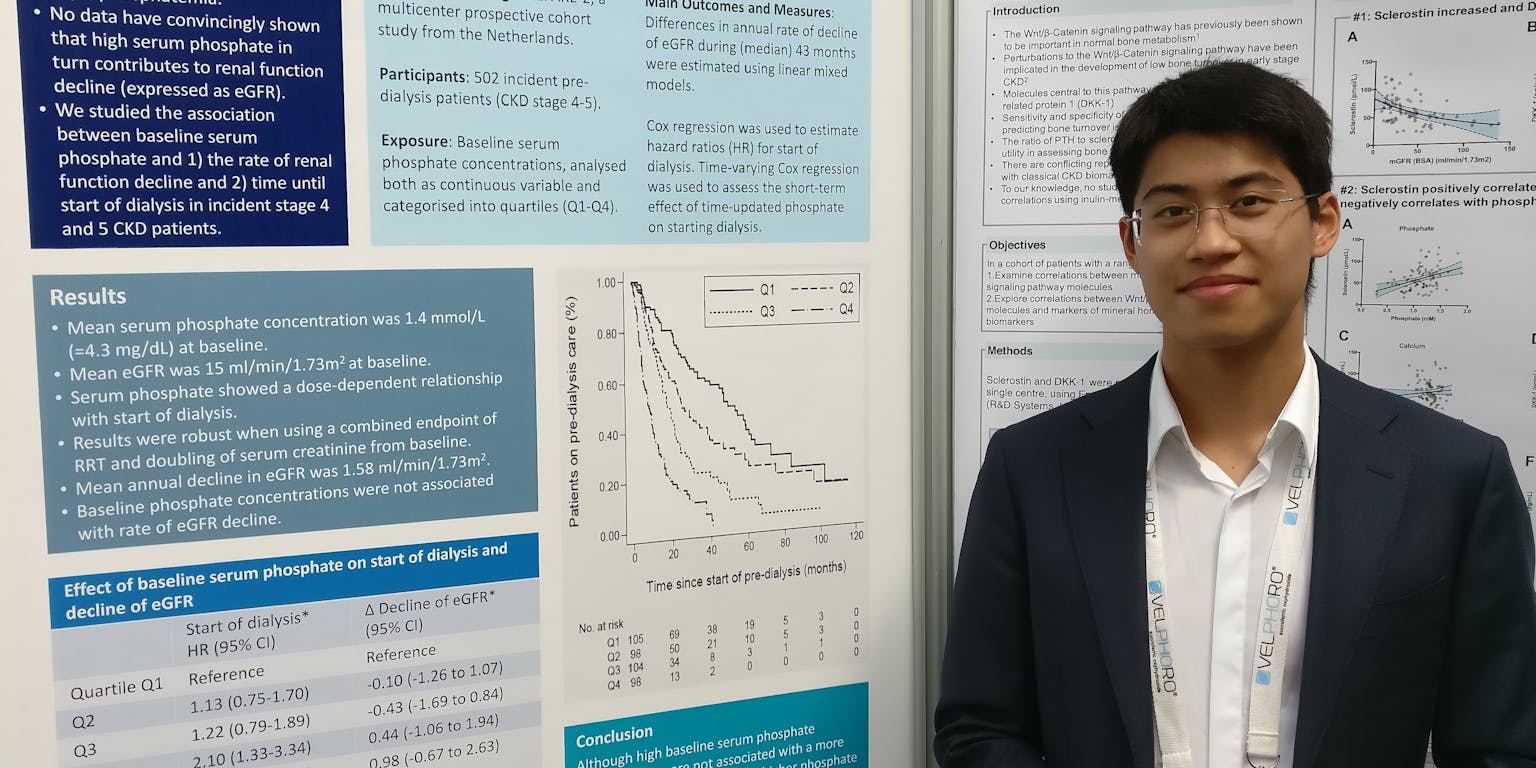 Naast dat je veel nieuwe dingen leert, inclusief de nieuwste inzichten in de wetenschap, is er ook de mogelijkheid om op een congres je eigen onderzoek te presenteren. Hiervoor moet je een abstract insturen, een soort korte samenvatting van je onderzoek. Afhankelijk van de kwaliteit van het onderzoek wordt dan je abstract afgewezen, of mag je het gaan presenteren. Gelukkig werd mijn abstract geselecteerd voor een presentatie. Bij dit onderzoek, dat ik was begonnen als geneeskunde student, keken we of afwijkingen in de mineraalhuishouding leidden tot een snellere achteruitgang van de nierfunctie.