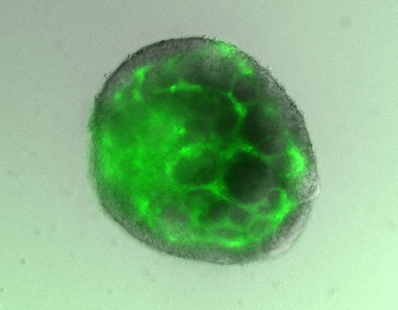 Een muizengastruloïde van een paar dagen oud. De delen die groen oplichten zijn bloedvaten.