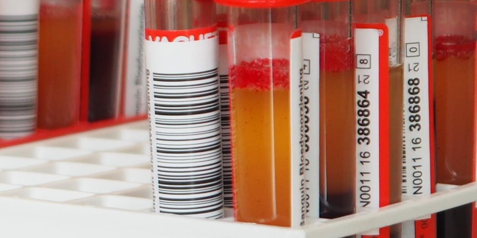 Testbuisjes gevuld met bloed, in de meest rechtse zijn duidelijk gescheiden het bloedplasma (gelig) en de rode bloedcellen te zien.